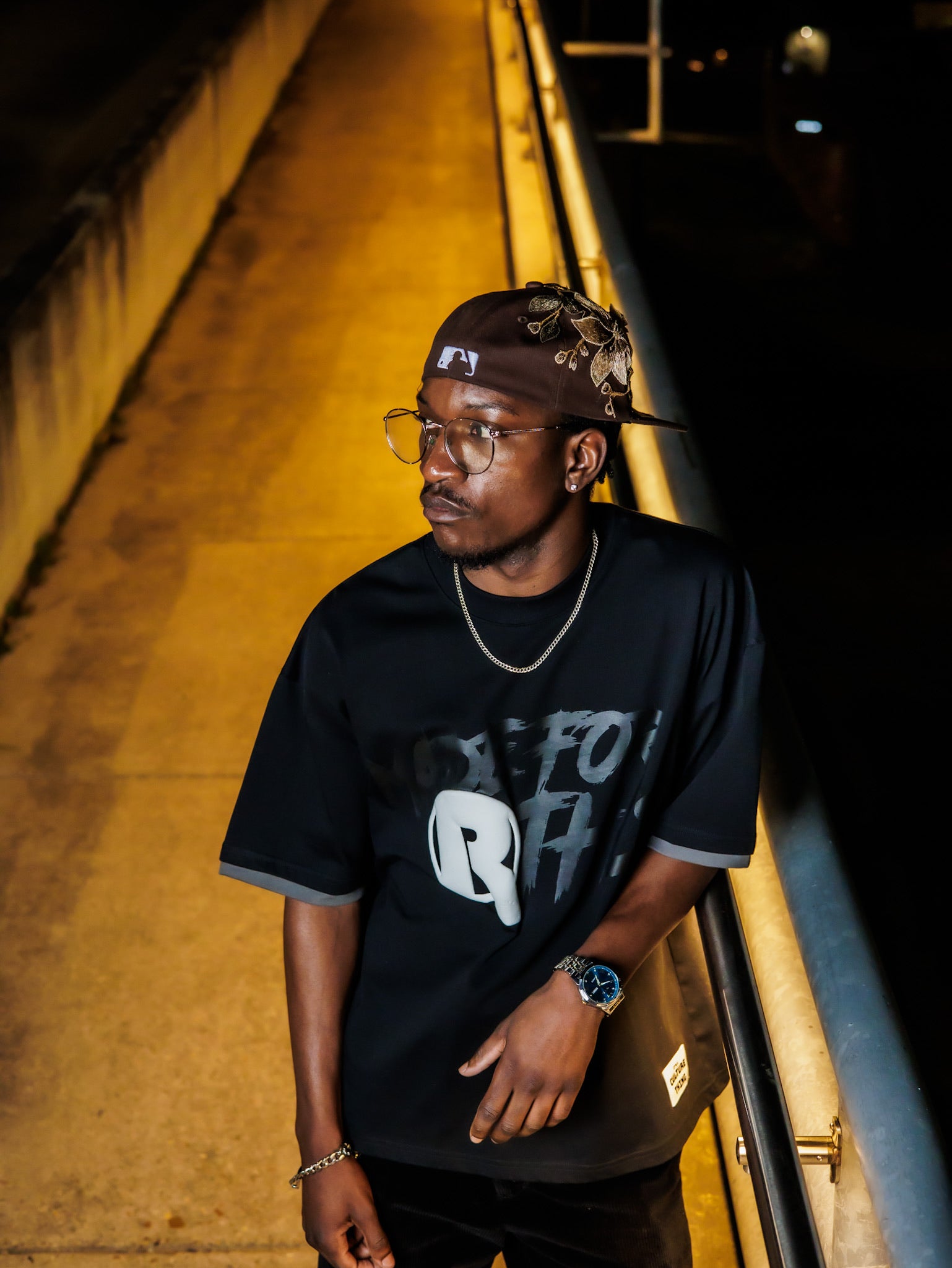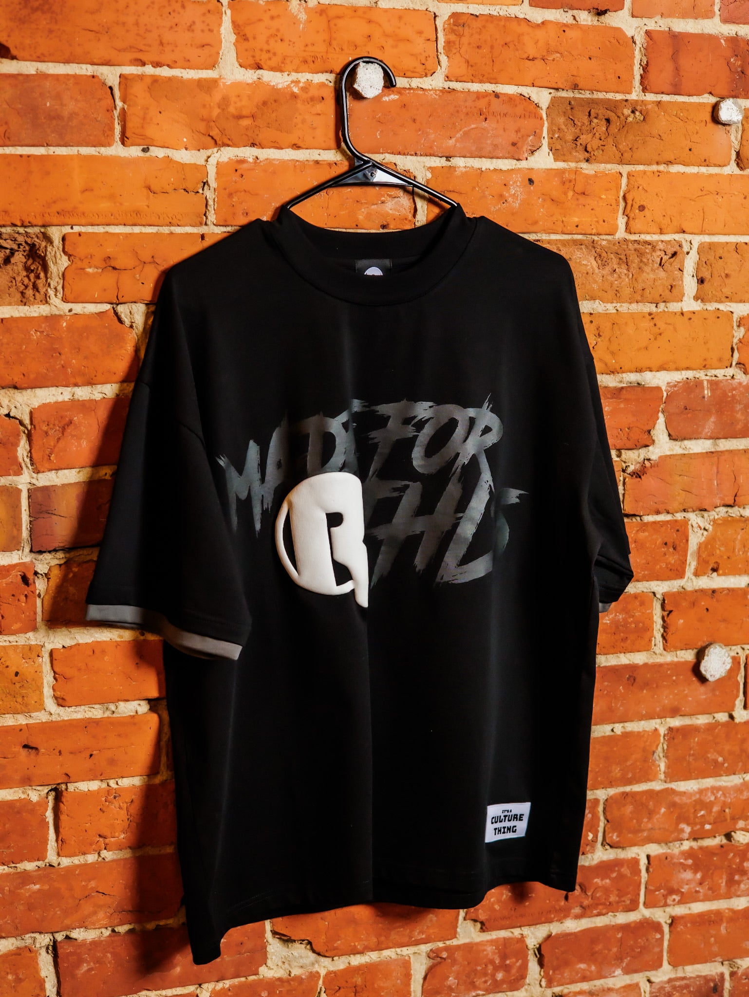 This black t-shirt blends bold typography with graphic edge. The front showcases a large stylized “R” logo layered beneath an eye-catching, graffiti-inspired text design reading “Made for This.” The distressed, street-art aesthetic adds attitude and movement to the piece. Cut in a relaxed fit, it delivers a confident, performance-ready energy while maintaining wearable comfort.